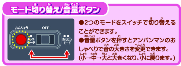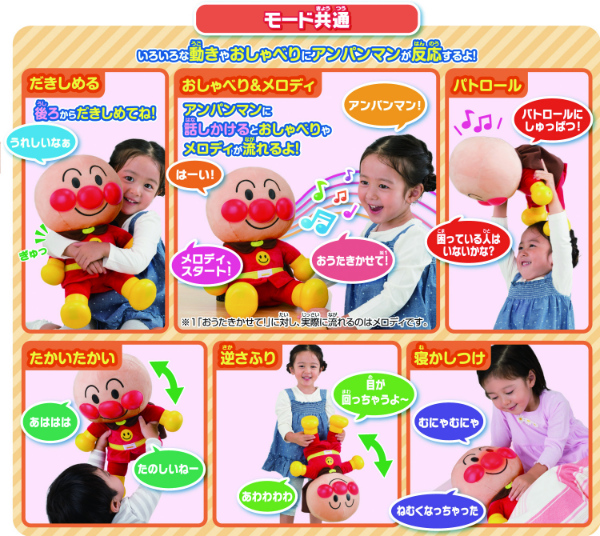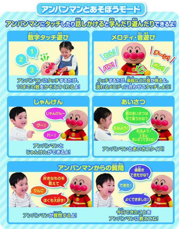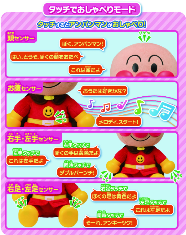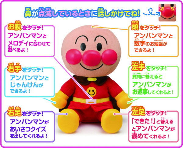 お子様に大人気のアンパンマンがおしゃべりしてくれる「はじめてのおしゃべりDX」が、小さなお子様でも楽しめる遊びやおしゃべりが増えてリニューアル!タッチセンサーに触れたり、話しかけて遊ぶコミュニケーション型トイ人形です。柔らか素材で抱き心地も良く、アンパンマンが本当の友達になったようにふれあい、楽しく遊べます。「アンパンマン!」と呼びかけてあげると、「ぼくを呼んだかな?」等のお返事をしてくれます。お腹にセンサーが入り、抱きしめると「うれしいなあ」といったおしゃべりをしてくれます。傾斜センサーが入っており、「寝かしつけ遊び」や「パトロール」といったごっこ遊びも楽しめます。アンパンマンを仰向けに寝かせると鼻がほんわり光ったり消えたりします。寝かせたままトントンしてあげると、「むにゃむにゃ」等眠そうにおしゃべりをしてくれます。「おうたきかせて!」等「うた」というワードを認識すると、楽しいメロディが流れるようになりました。