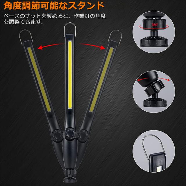 【COB LED採用】高輝度の「COB」LED搭載、「COB」LEDとは大光量で単一面発光するLEDです。 均一なひとつの面で発光するため、光のバラツキを抑えます。普通の作業灯より、強い明るさになれます。360度で全方向均一に0-450LM(8W)の高輝度を提供します。【明るさ/角度を調節可能】 ライトの前は回転式スイッチが付いていますから、回転式スイッチを右に回して、スイッチをONになれてから、照明度はどんどん明るくになれます。底部はベースのナットを緩めて、作業灯のアングルを自由に調節することができます。場所によって、好きな角度を調節することができます。