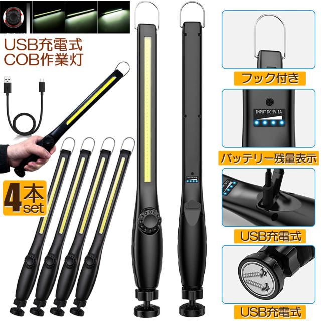 作業灯 LED ワークライト 4個セット USB充電式 450ルーメン COBライト 懐中電灯 360°回転 フック マグネット 磁気付き 無段階輝度 調整スイッチ 緊急用照明 停電用 車修理 夜間作業 家 屋外 アウトドア キャンプ 工事現場 車載用