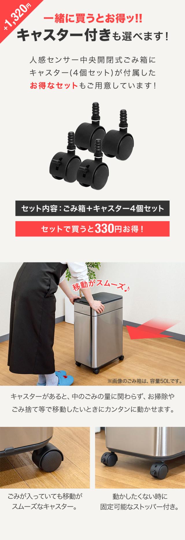 | 特記事項: ・こちらのキャスターは「人感センサー中央開閉式ごみ箱(容量 40L/50L/60L 乾電池タイプ/USB給電タイプ 共通)」用となります。 ・ごみ箱本体は付属いたしませんのでご注意ください。 |