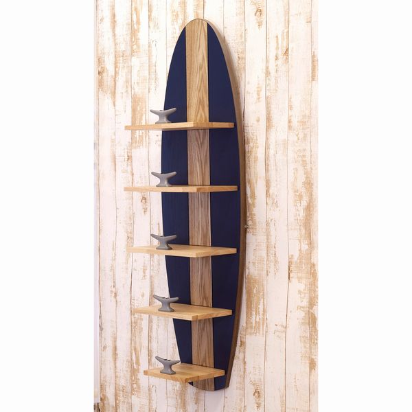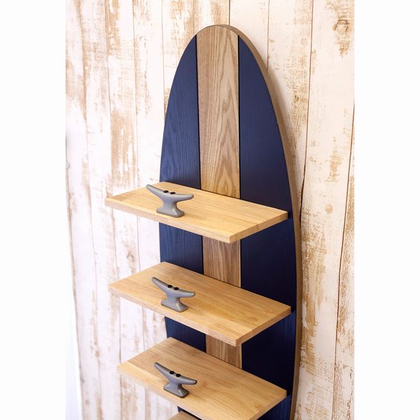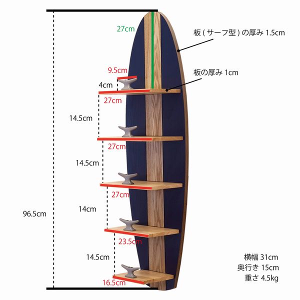 | サーフボードモチーフのウォールシェルフです。 ボードに5段の棚がついています。 しっかりとした作りで、安定感があります。 ※重量が4.5kgありますので、壁にしっかりとネジ固定をしてください。 |