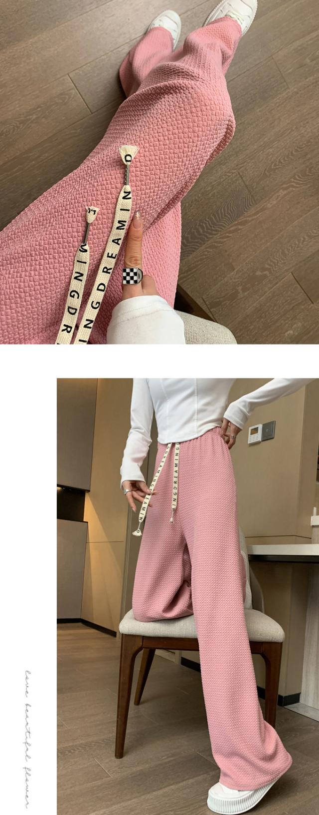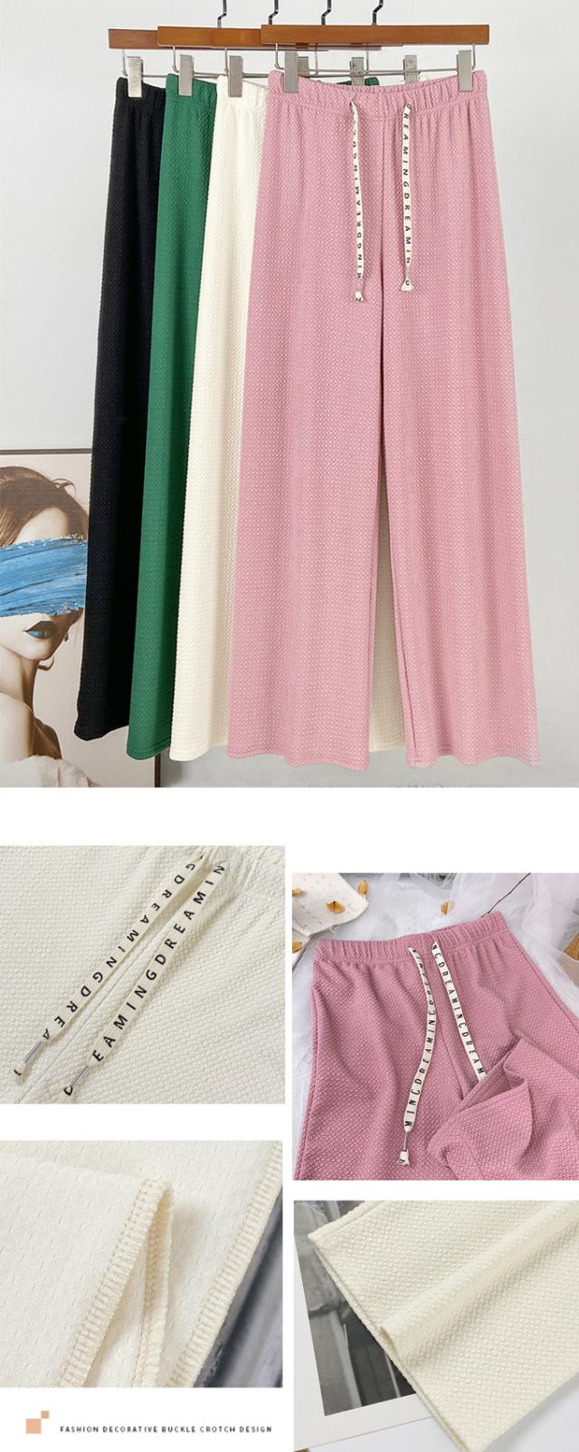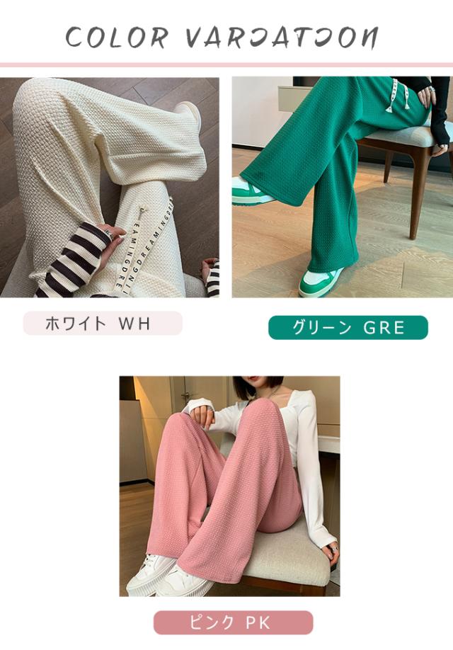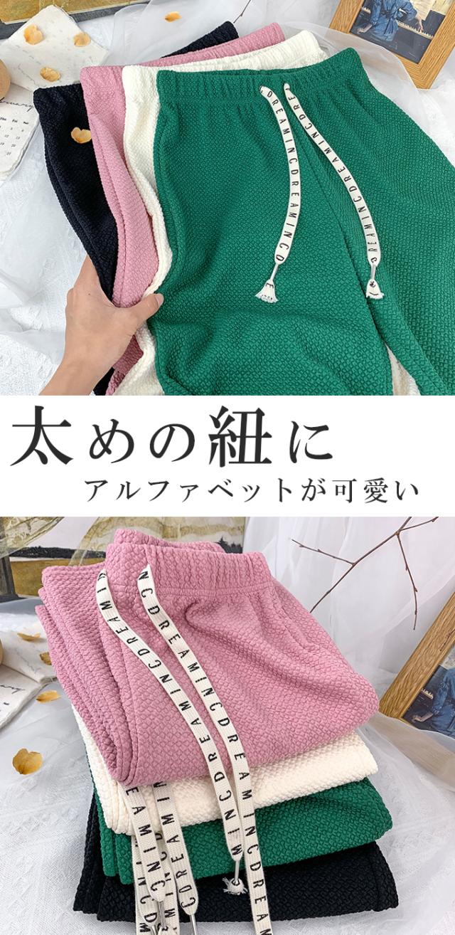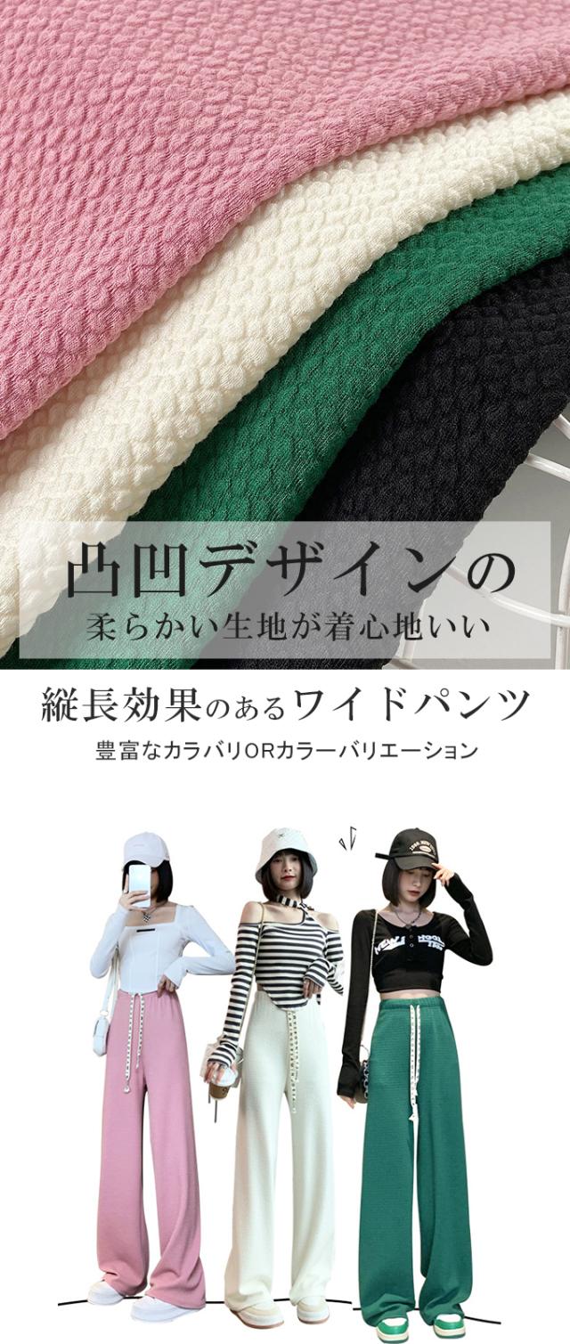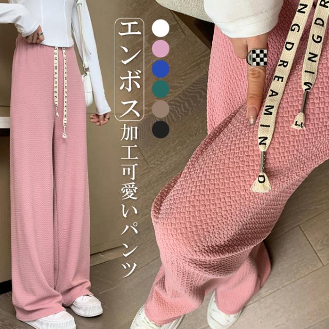 春新作 レディース パンツ エンボス加工 凹凸感生地 ワイドパンツ ストレートパンツ 楽ちん ウエストゴム 春 ウェスト紐付き 調整可 きれいめ カジュアルパンツ