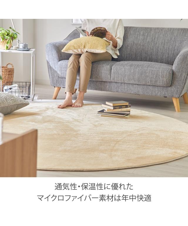 きめ細かく、柔らかなマイクロファイバーを使用した、豊富な10色2サイズのカラーラグです。やわらかな肌触りが最大の特徴です。円形ラグはお部屋を広く見せ、優しい印象にしてくれます。薄手タイプのこのラグは、お掃除のときの移動や敷き替えのときもラクラク!汚れても、洗濯機で洗えるのはうれしいポイントです。裏面には滑りにくい加工を施しているので、ズレにくく、お掃除も楽々です。柔らかな肌触りをおためしください