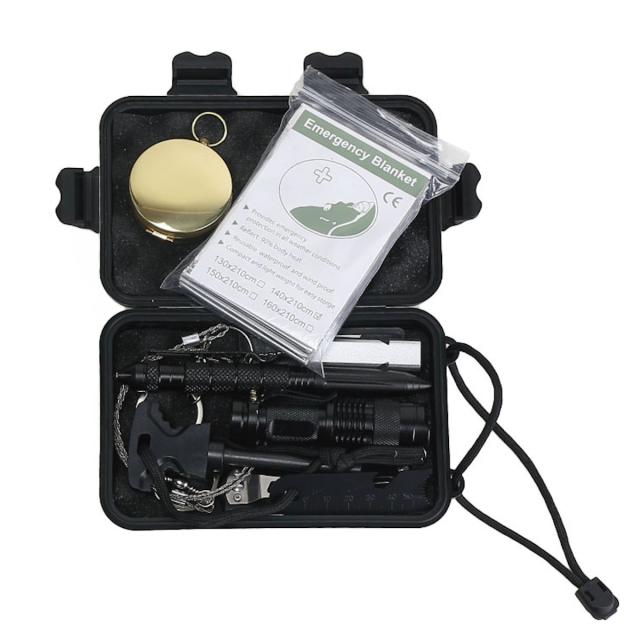 アウトドアツールセット 11点 ( 防水ケース ワイヤーソー 緊急ブランケット コンパス ホイッスル LEDライト ナイフ ニードルペン ファイヤースターター スクレーパー 多機能カード アウトドア マルチツール セット )
