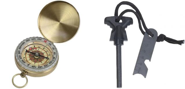 | コンパス 夜間にも便利な高感度蛍光コンパスです。道に迷ったり、霧の中でも役立ちます。 | スクレーバー& ファイヤースターター 難しい火起こしもこれならラクラクです。 |