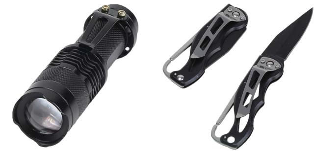 | LEDライト 突然の停電や緊急時に役立つ長寿命のLEDライトです。明るさ調節機能に緊急信号として使えるフラッシュ機能もあります。 | ナイフ 黒のステンレス刃と黒のアルミ合金ハンドルのナイフです。錆び止め効果もあり丈夫で長持ち、お肉も野菜も何でも切れて便利です。 |