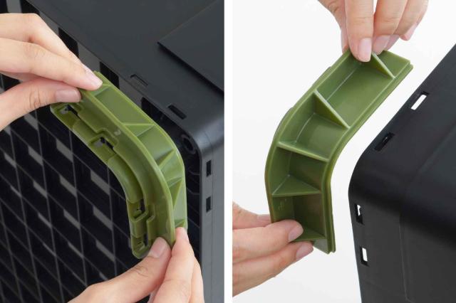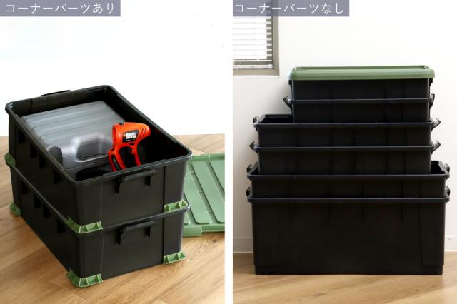 底の四隅に付けられるコーナーパーツは用途に合わせて取り外しが可能です。付けた状態であれば、フタがなくてもボックス同士を安定して積み重ねることができます。ボックスを使用しない時は取り外して、入れ子状態にしてコンパクトに保管しておけます。