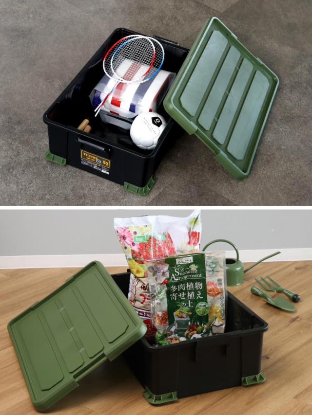 持ち運びに便利なコンテナケースは、キャンプなど屋外のアクティビティや、ガレージで使用する道具入れにするのもオススメです。フタが雨水や砂ぼこりの侵入を防ぎ、汚れてもサッと水洗いできます。