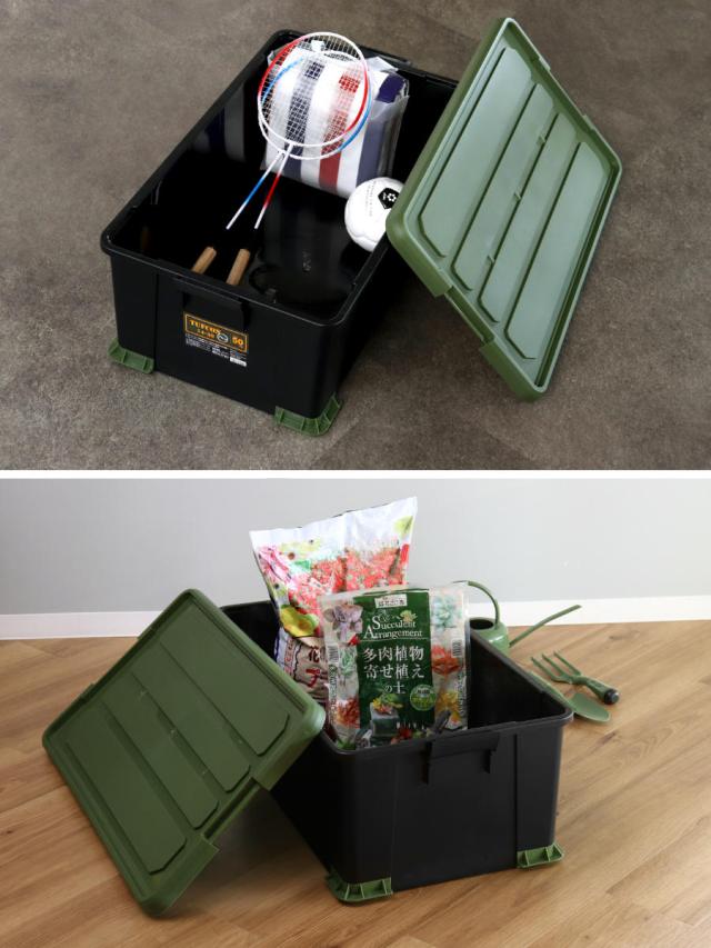 持ち運びに便利なコンテナケースは、キャンプなど屋外のアクティビティや、ガレージで使用する道具入れにするのもオススメです。フタが雨水や砂ぼこりの侵入を防ぎ、汚れてもサッと水洗いできます。