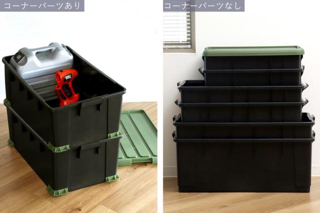 底の四隅に付けられるコーナーパーツは用途に合わせて取り外しが可能です。付けた状態であれば、フタがなくてもボックス同士を安定して積み重ねることができます。ボックスを使用しない時は取り外して、入れ子状態にしてコンパクトに保管しておけます。