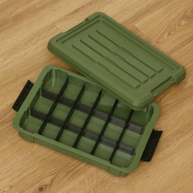 工具や日用品を収納しておくのに便利な収納ボックスです。細かい小物も仕切りで整理整頓でき、フタを閉めることで生活感を隠すことができます。ミリタリーテイストなデザインでリビングやキッチンなど見えるところに置いてもスタイリッシュさを保てます。