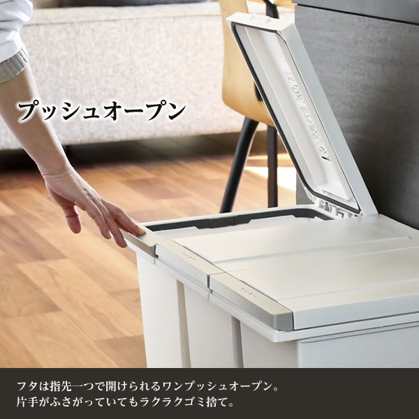 プッシュオープンフタは指先一つで開けられるワンプッシュオープン。片手がふさがっていてもラクラクゴミ捨て。