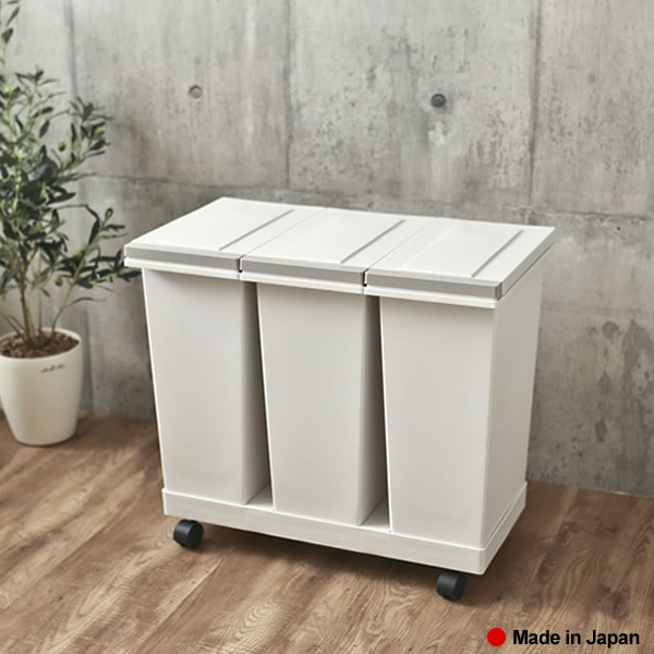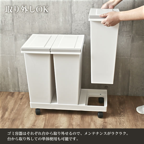 3つ一緒に移動できるコロ付き台だから移動OK!3つのゴミ箱を一括して動かせるから、床のお掃除もスムーズ。
