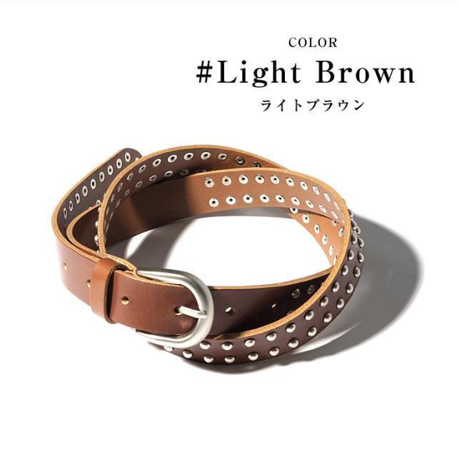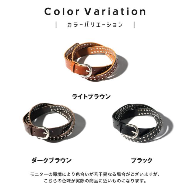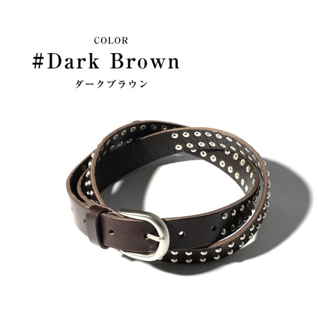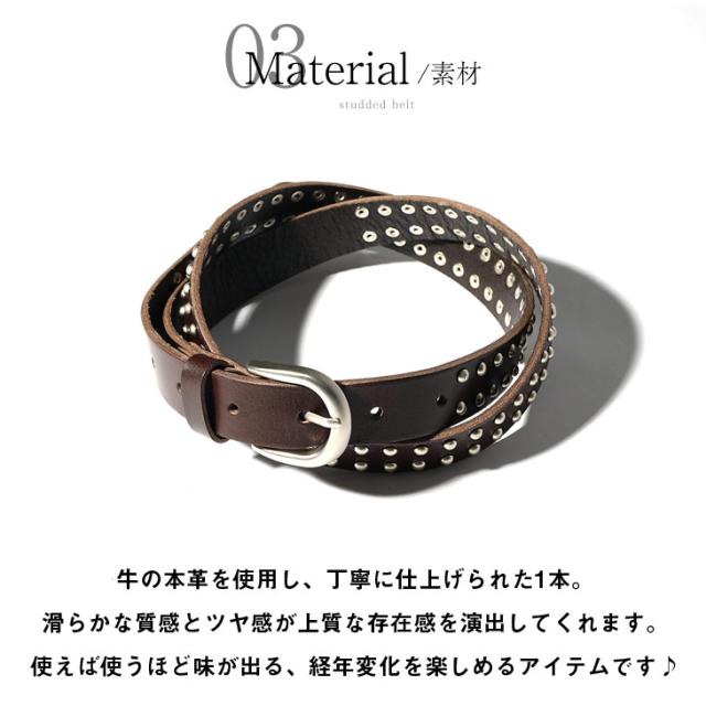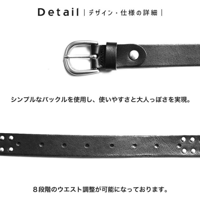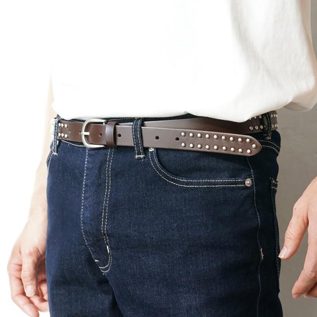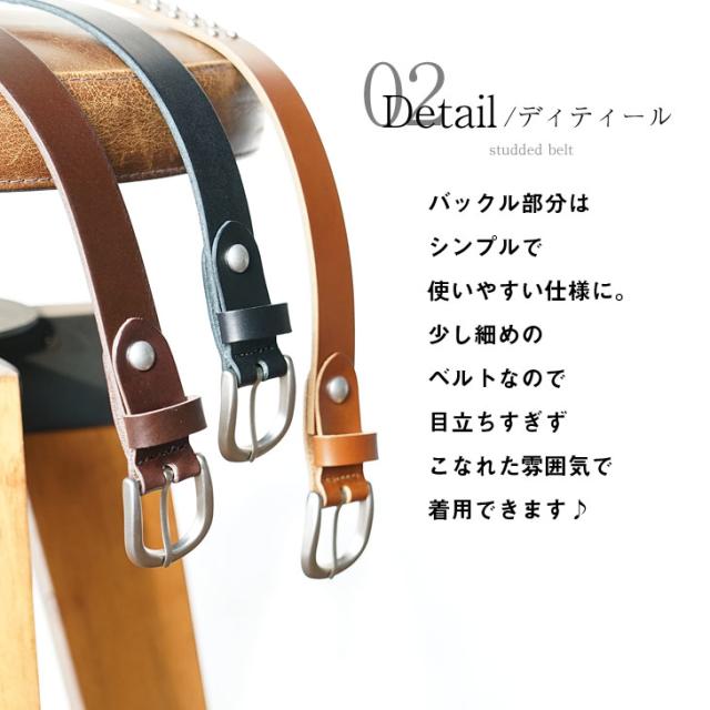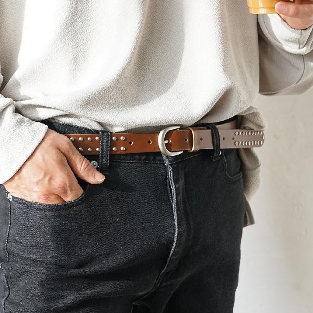 上質な雰囲気を醸し出す、牛革のベルトに、アンティーク調のスタッズが付いたデザイン。少し細めなベルトだから目立ちすぎずこなれた雰囲気で着用できます。