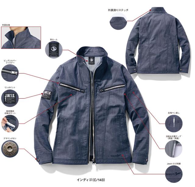 背ネーム、ビッグシルバーファスナー、ワンポイント、携帯電話収納ポケット、デザインボタン、左袖ペン差し、消臭・抗菌テープ(両脇・両肩)、Jawinロゴ刺繍