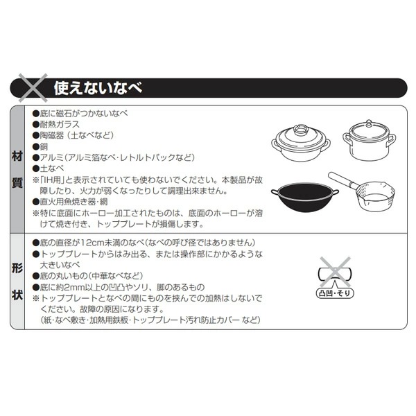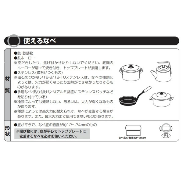 ●ガラスタッチキーを採用 見映えの良さと軽快な操作感を実現しました。 ●汚れたらサッと一拭き トップガラスがフルフラットなので清掃性が格段に向上しました。 ●リニューアルに最適 古くなったクッキングヒーターからの入替えをオススメします。見映えが良くなり他とは違うキッチン空間を演出。 もちろん他社製品からの入替えも可能です。 ※一部入替え出来ないタイプもございます。 ■定格:単相 200V(50Hz/60Hz)-2000W ■大きさ:幅320×奥行き353×高さ85mm ■重さ:約3.3kg ■ヒーター:消費電力:2000W/火力調節:300W相当〜2000W 5段階 ■コード:2.0平方mm3芯キャブダイヤコード 長さ0.6m ■差し込みプラグ:2極 15A・250V ■安全装置 やけど注意:トッププレートが高温の時ランプ点灯 切り忘れ防止:最終操作後約45分で自動OFF 空焚き検知:鍋底センサーが空焚きを検知し自動停止 鍋なし検知:鍋底センサーが鍋なしを検知し自動停止 ■付加機能:温度調節機能:保温・160℃〜200℃ 5段階 ※記載は商品仕様の一部です。仕様説明不足等の理由での返品はできません。特に適合等は必ずご確認ください。