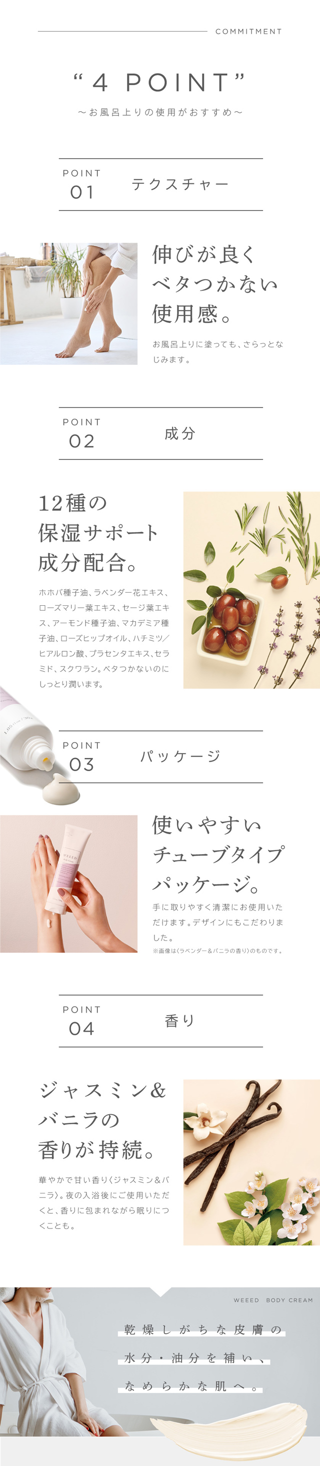 WEEED ボディクリーム 100g ジャスミン&バニラの香り 保湿 クリーム 全身 べたつかない しっとり チューブタイプ 乾燥 肌 お風呂上り 女性