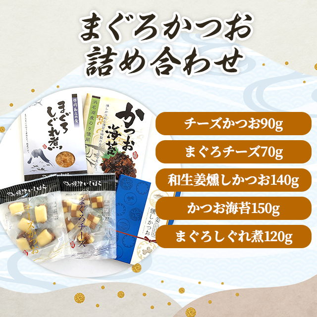 商品名 まぐろかつお詰め合わせ 容量 5種セット(チーズかつお90g、まぐろチーズ70g、和生姜燻しかつお140g、かつお海苔150g、まぐろしぐれ煮120g) 原材料名 【チーズかつお】かつお(国産)、乳等を主要原料とする食品(ナチュラルチーズ、還元水飴、ショートニング、ゼラチン)、砂糖、醤油、還元水飴、米発酵調味料、寒天/乳化剤、(一部に乳成分・ゼラチン・小麦・大豆を含む)