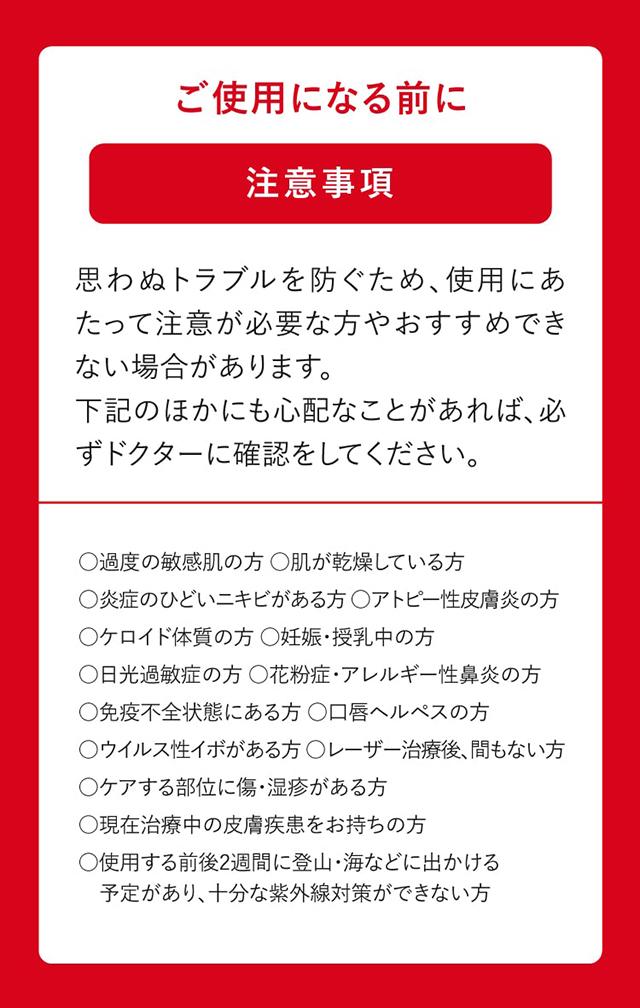 | 使用上のご注意 | ※パッケージの注意事項をご確認ください。その他、アトピー性皮膚炎、ケロイド体質、皮膚に傷、湿しん、炎症、アレルギーその他皮膚疾患、過去にスキンケア用品で大きなトラブルが生じた方は医師にご相談の上ご使用ください。 |