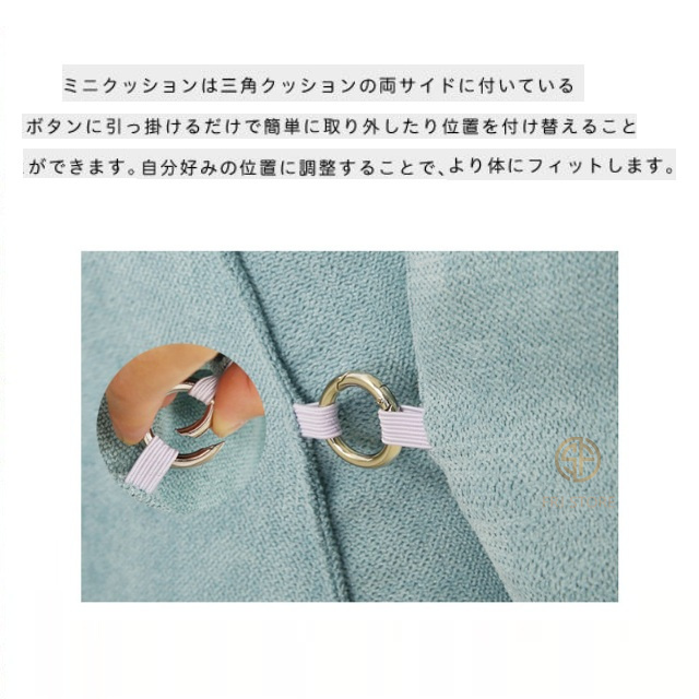 付属の枕は、独立させて使用するも良し、クッションの各ボタンにつけることで、多様な使い方を実現します!
