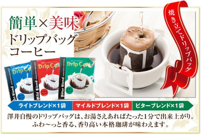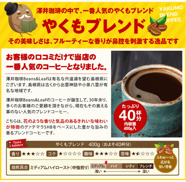 | 内容量 | 【レギュラーコーヒー】 ・リッチブレンド(シティロースト) 400g ・ハローブレンド(ハイロースト) 400g ・やくもブレンド(ミディアムハイロースト) 400g 【ドリップコーヒー】 ・ライトブレンド 1袋 ・マイルドブレンド 1袋 ・ビターブレンド 1袋 |