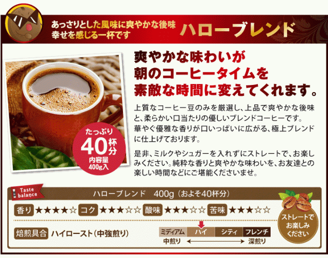 | 産地 | 【リッチブレンド・ハローブレンド】ブラジル、エチオピア他 【やくもブレンド】ガテマラ,ブラジル他 【ライトブレンド】ブラジル、コロンビア他 【マイルドブレンド】ブラジル,エチオピア他 【ビターブレンド】インドネシア,ブラジル他 |