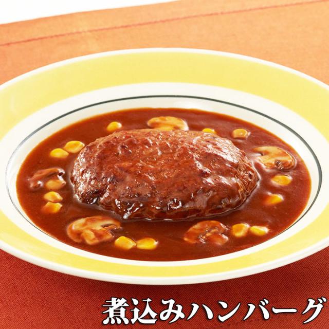 ・煮込みハンバーグ[ハンバーグ(牛肉、豚肉、鶏肉、玉ねぎ、パン粉、その他)(国内製造)、マッシュルーム、ソテーオニオン、
