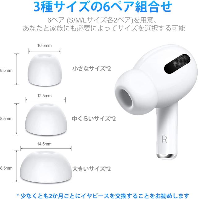 AirPods Pro イヤーピース 交換用 6ペア [S/M/Lサイズ各2ペア] シリコン イヤーチップ AirPods Pro第1 & 第2世代 対応 イヤーピース分離可能 遮音性 フィット感 脱落防止 収納ケース付き ホワイト