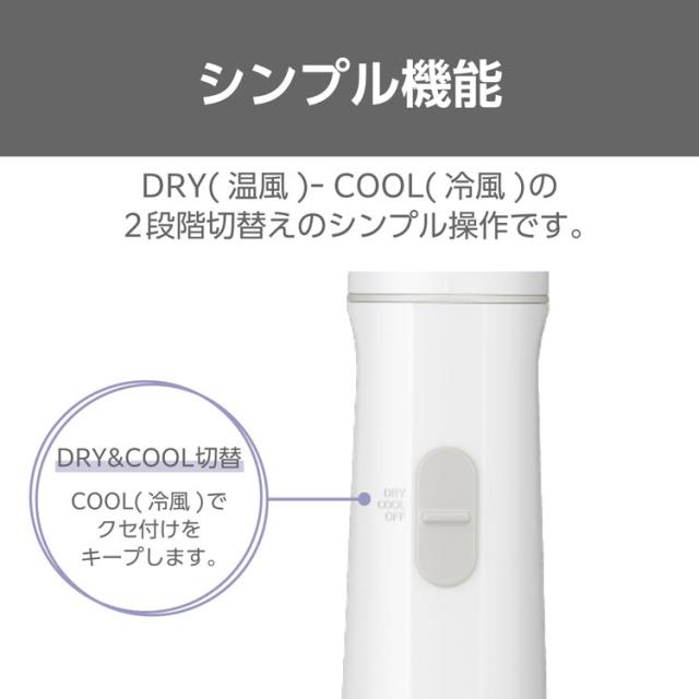 ●DRY(温風)ーCOOL(冷風)の2段階切替えのシンプル操作。COOL(冷風)でクセ付けをキープします。