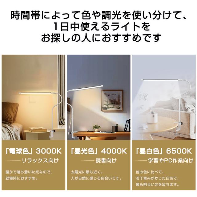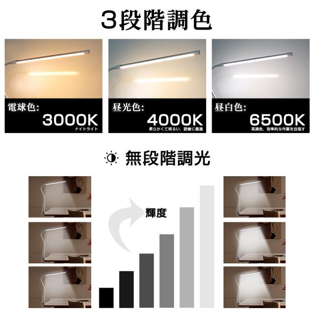 デスクライトの電源スイッチとを押すと、自由に三段階調色、電球色、昼白色と昼光色の順に調色でき、無段階調光機能が搭載され、使用シーンに合わせてお好みの色と明るさが変えられます。ナイトライトとしても勉強机用電気スタンド、PC作業用スタンドライトとしても使用可能なledデスクライトです。