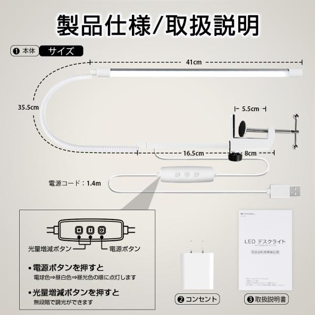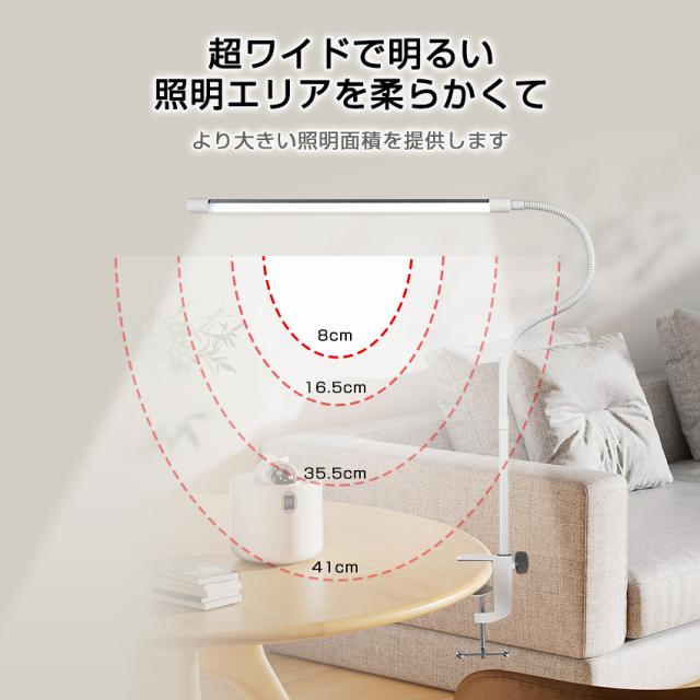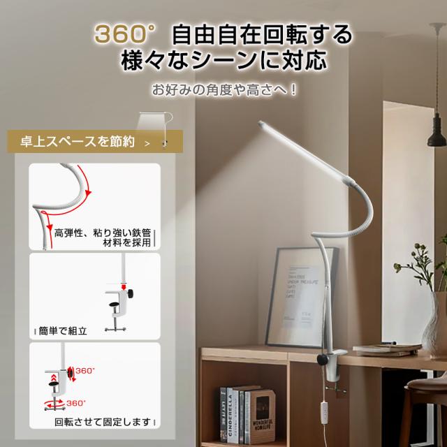 クリップライトのグースネックアーム構造及び360°の回転可能、上下左右を自由にアームライトを任意の光の方向に調整可能で、最適化することができます。 デスクライトのクランプ部分はプレミアム素材でしっかり出来上がって、5.5cmまで挟まれ、読書スペースと作業スペースを最大限にお使いいただけます。