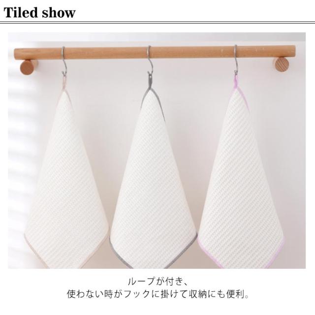 | 台拭き或いは食器拭きとしては最適なキッチンタオル。 ループが付き、使わない時がフックに掛けて収納にも便利。 細かな汚れや表面上に付着した汚れを簡単に落とせます。 拭きあとに水滴が残らなく、水痕も残りません。 優れワッフル生地で、肌触りも吸水性も速乾性も良いです。 | |