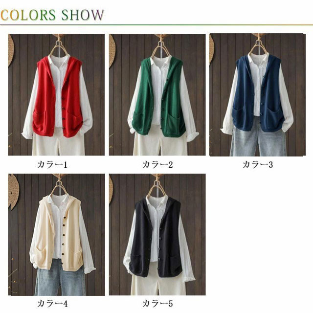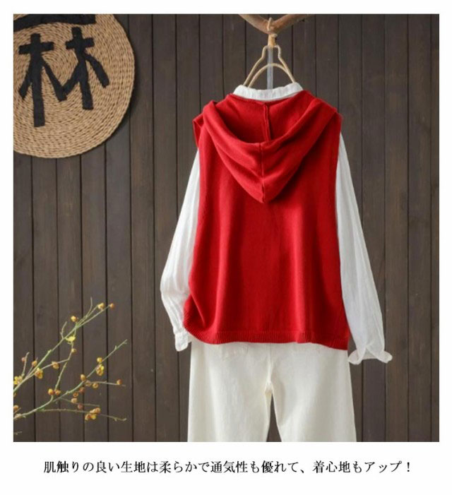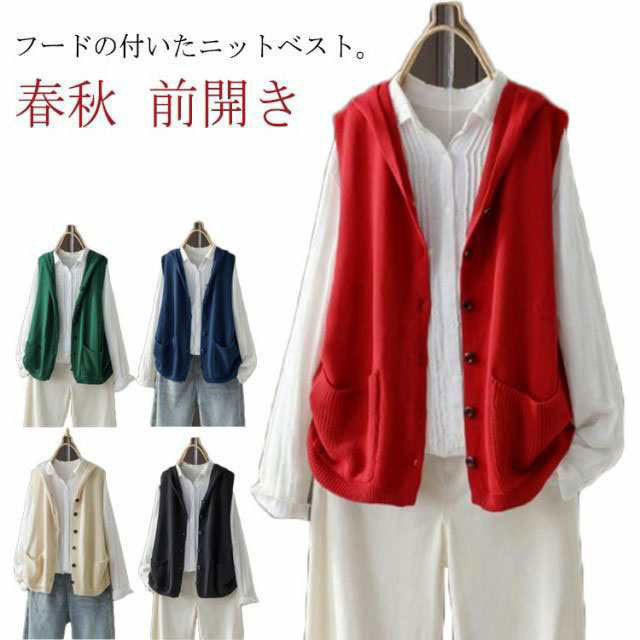 ニット ベスト レディース 春秋 フード付き ニットベスト 前開き 春ベスト おしゃれ ニットトップス 体型カバー ノースリーブ シンプル カジュアル レイヤード 重ね着 定番 全5色 30代 40代 50代 S M L XL 2XL 3XL