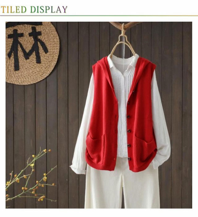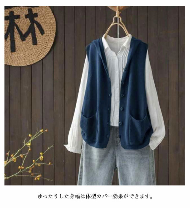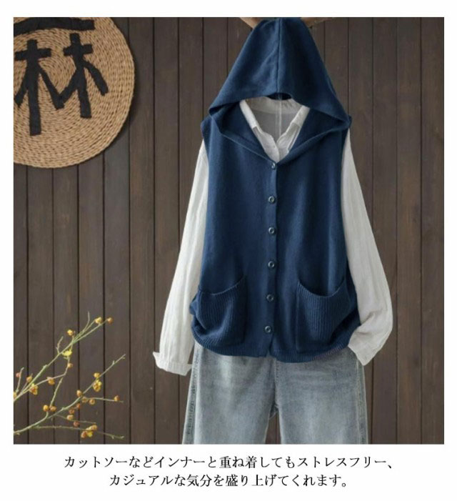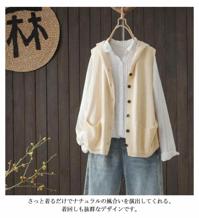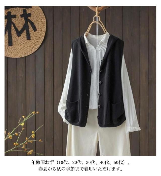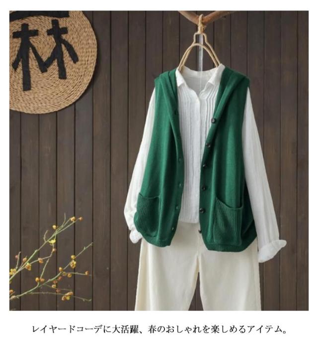 | フードの付いたニットベスト。 レイヤードコーデに大活躍、春のおしゃれを楽しめるアイテム。 肌触りの良い生地は柔らかで通気性も優れて、着心地もアップ! ゆったりした身幅は体型カバー効果ができます。 カットソーなどインナーと重ね着してもストレスフリー、カジュアルな気分を盛り上げてくれます。 さっと着るだけでナチュラルの風合いを演出してくれる、着回しも抜群なデザインです。 年齢問わず(10代、20代、30代、40代、50代)、春夏から秋の季節まで着用いただけます。 | |