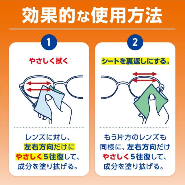 ・シートがぬれているうちに、レンズに対して左右方向だけにやさしく5往復して、くもり止め剤を塗り広げてください。