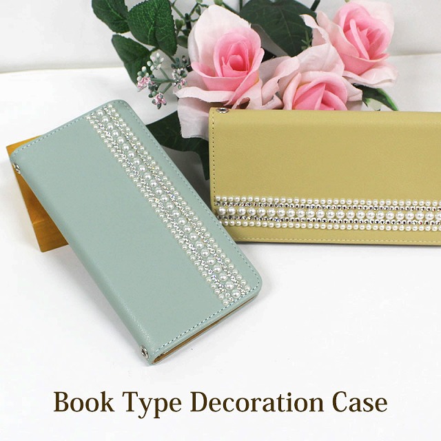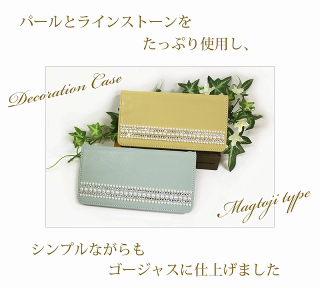 くすみカラーの手帳にパールとラインストーンを並べたスマホケースです。