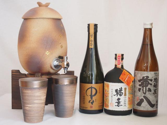 信楽焼・明山窯 焼酎サーバー 火色金小紋 2200cc(滋賀県)+萬古焼・備前金彩焼酎ペアカップ(三重県)+芋焼酎 兼八 中々 猶薫 720ml