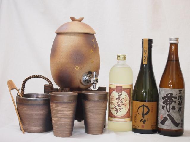 信楽焼・明山窯 焼酎サーバー 火色金小紋 2200cc(滋賀県)+萬古焼・備前金彩焼酎ペアカップ 氷入れ(三重県)+麦焼酎 芋焼酎 夢のひととき 中々兼八 720ml