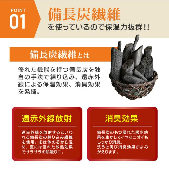 遠赤外線を放出するといわれる備長炭の効果で、冬は体の芯から温め、夏には優れた放熱効果でサラサラの手触りに。