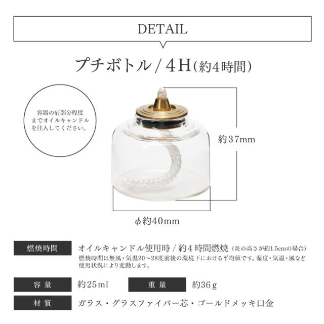 | サイズ | 【トゥルムランタンミニ】 本体サイズ:φ98×H185mm(ハンドル含む) ホヤサイズ:φ58×H84mm 重量:210g 【オイルキャンドル】 容量:250ml 【プチボトル】 【4H】φ40×H37mm 容量:約25ml 【6H】φ40×H43mm 容量:約30ml |