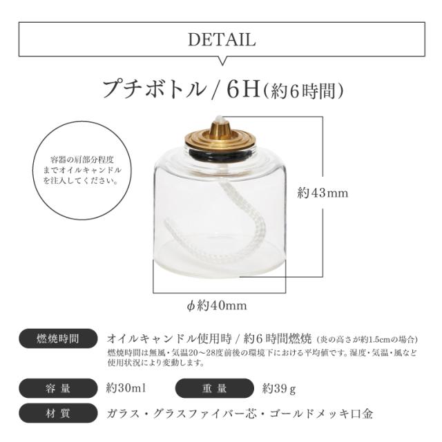 | セット内容 | ・トゥルムランタンミニ×1 ・オイルキャンドル 250ml×1 ⇒オイルキャンドルの詳しい情報はこちらから ・プチボトル4H or 6H×1 ⇒プチボトルの詳しい情報はこちらから |
