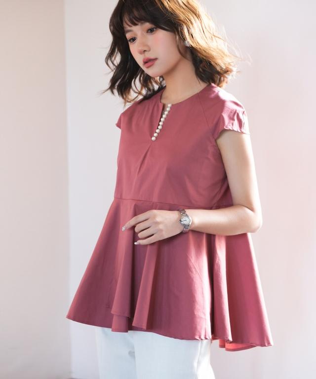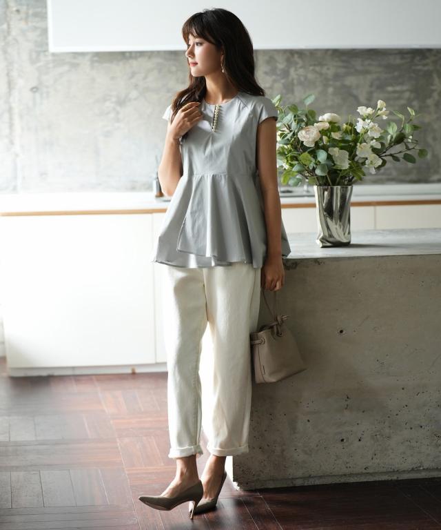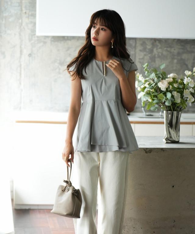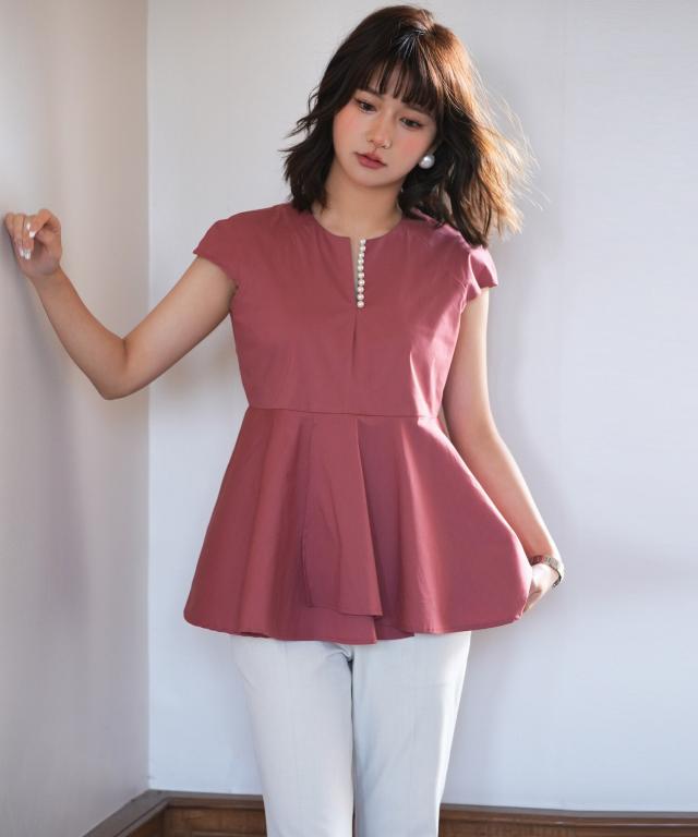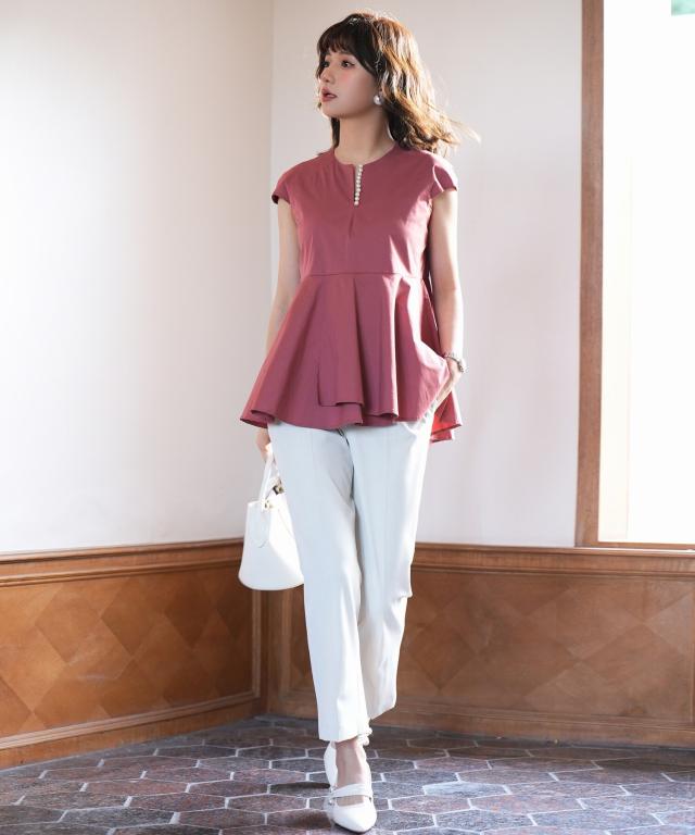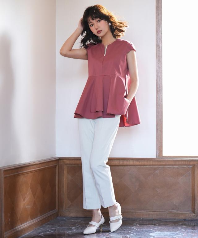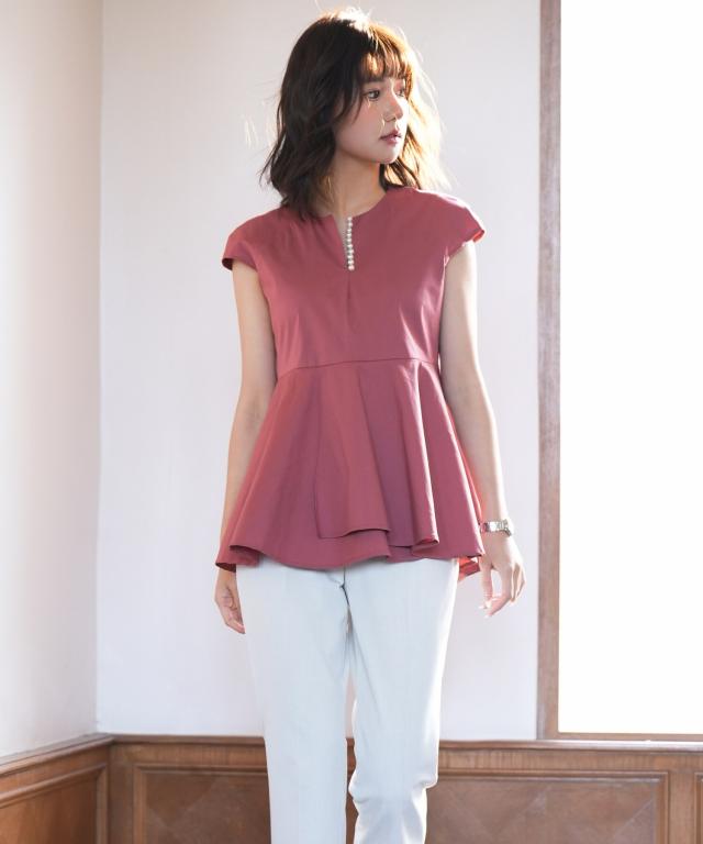 首元のパールが上品な印象を醸し出す大人女子があふれるペプラムブラウスです。
