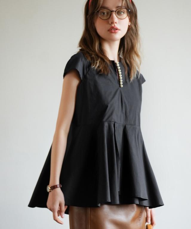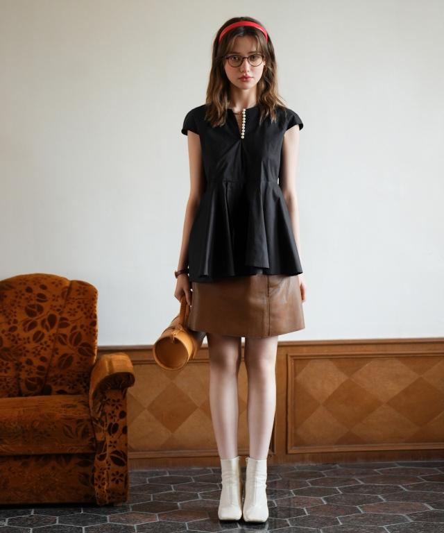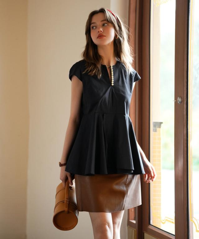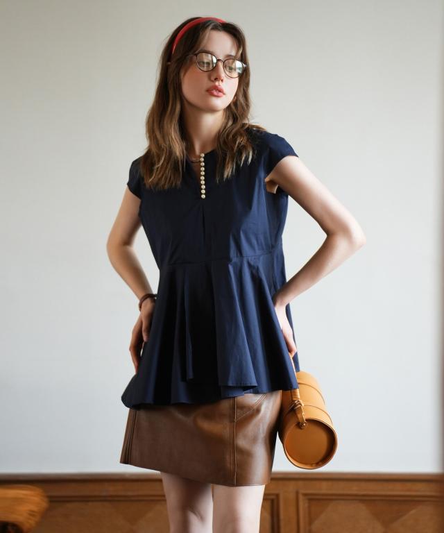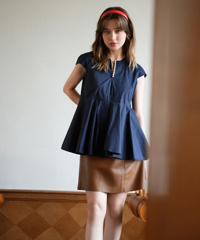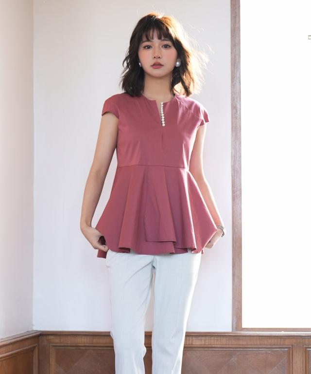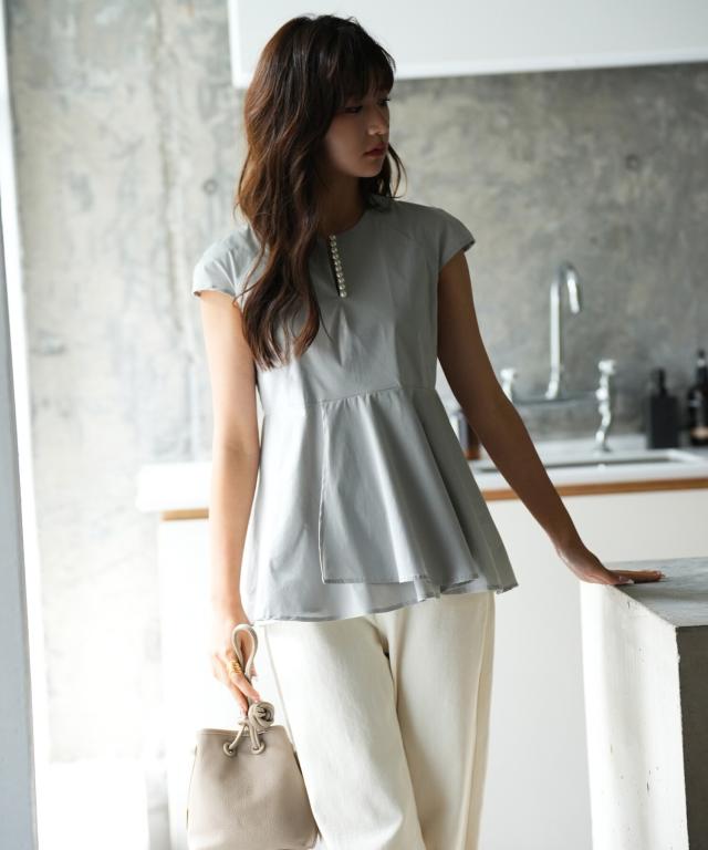 首元のパールが上品な印象を醸し出す大人女子があふれるペプラムブラウスです。