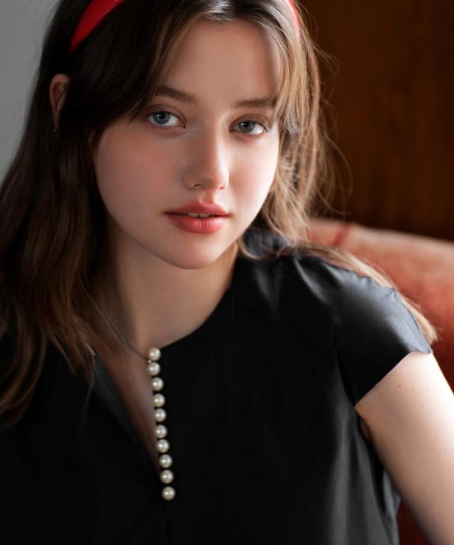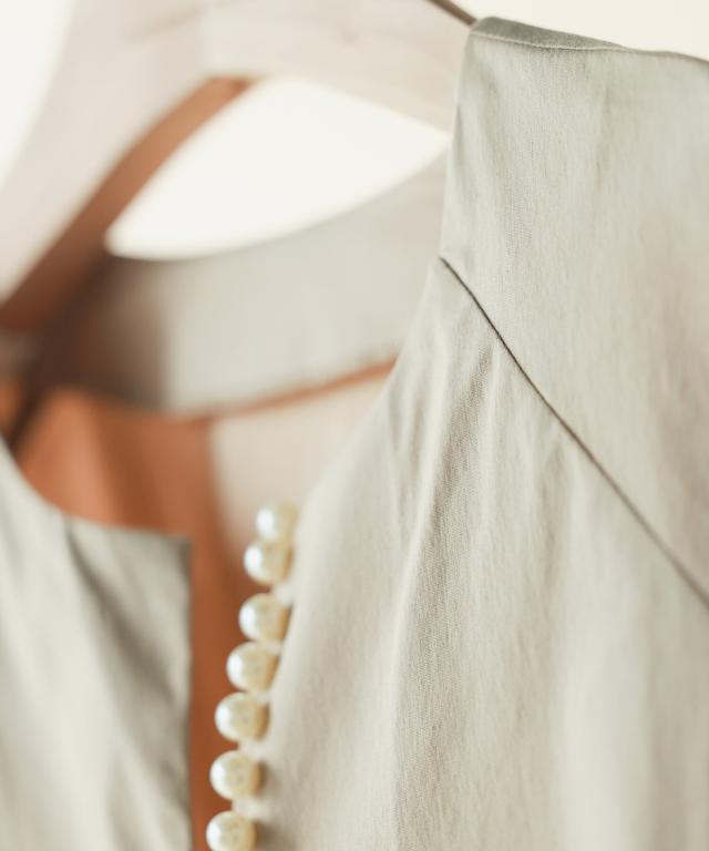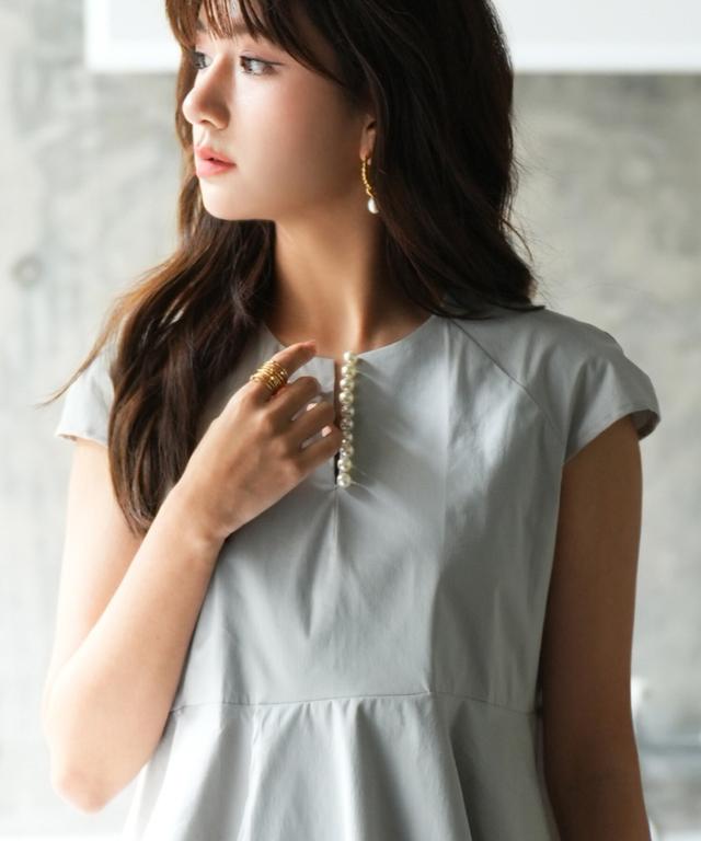 スキッパーのキーネックパール付きが上品な首元を演出。アクセいらずでこれだkで華やかな印象になります。