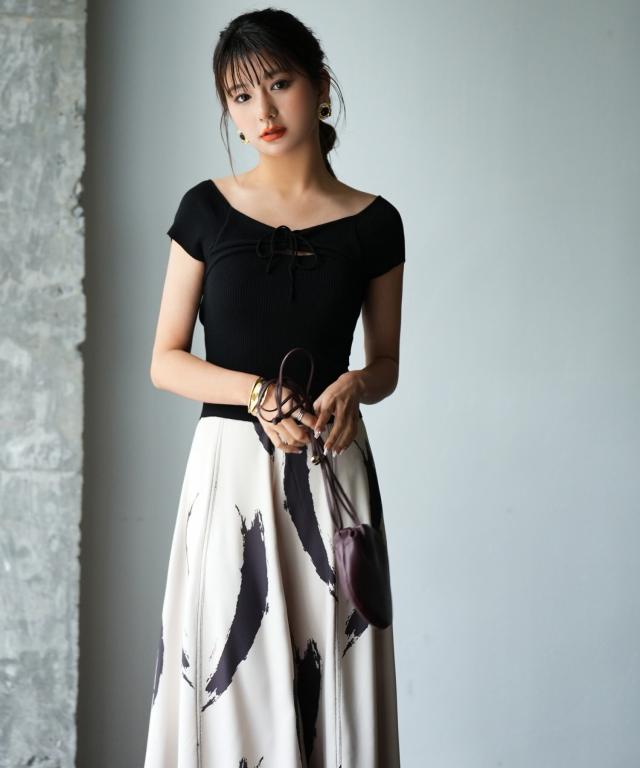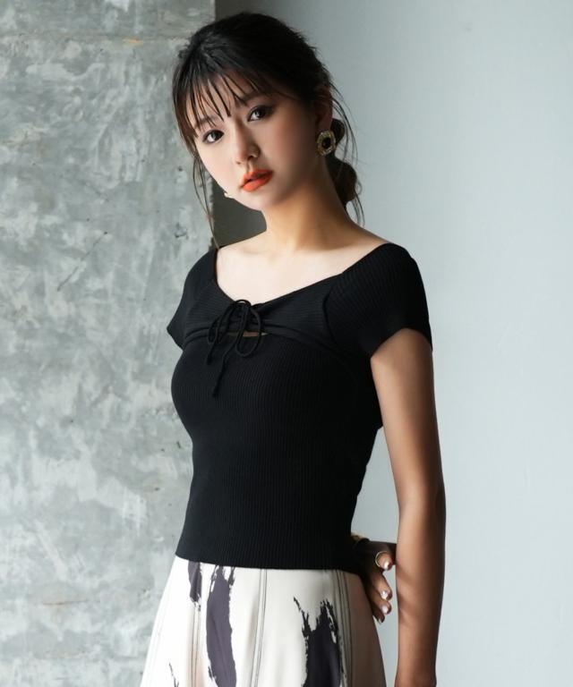 胸元に施されたリボンが調整可能なので、絞ってVネックにしたり、緩めてクルーネックにしたりすることができます。さらに緩めると、オフショルダーとしても着られるので、調節の加減次第でデザインを変えられます。
