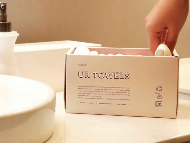 手を拭くのにちょうどいい大きさのタオルが10枚も入っているので、まるでペーパータオルのような感覚で、手洗いのたびに毎回新しいタオルを使えます。手を清潔にした後も、清潔なタオルで気持ちよく拭けば安心ですね。