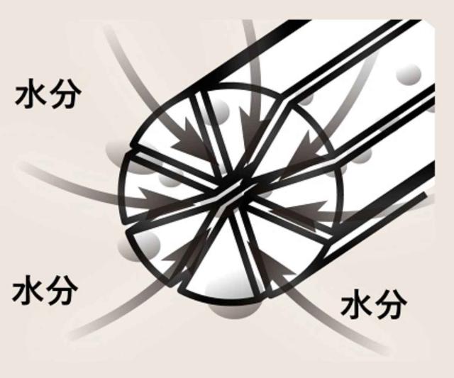 マイクロファイバー(超極細繊維)は、1本1本が放射線状の三角断面形状で無数の隙間を持っています。その隙間に大量の水分を吸水し、絞るとすぐに吸水力が戻ります。
