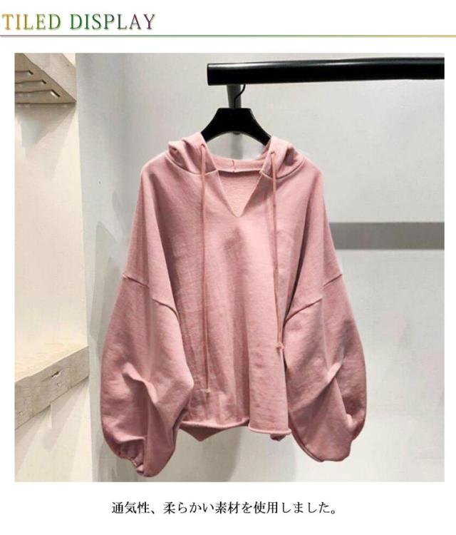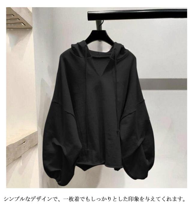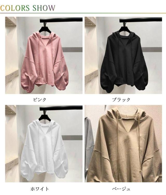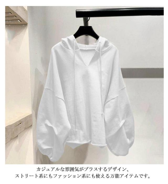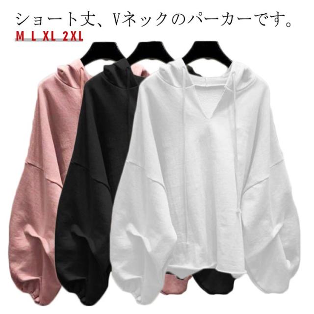ショートパーカー バルーン袖 レディース パーカー 長袖 ショート丈 フード付き Vネック ボリューム袖 レイヤード プルオーバーパーカー フードパーカー 重ね着 ゆったり カジュアル ダンス衣装 ビッグシルエット M L XL 2XL