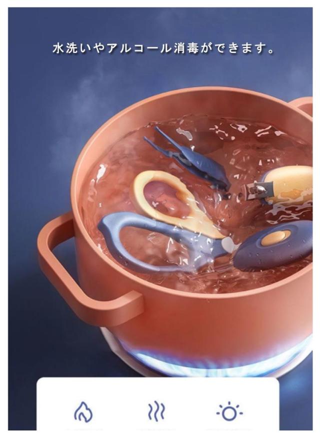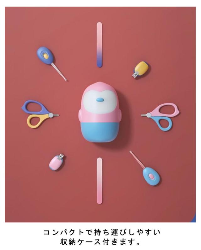 | 赤ちゃん用爪切りセット ネイルケア4種と耳かきまでついたお得な5点セット! コンパクトで持ち運びしやすい収納ケース付きます。 ハサミの先は赤ちゃんの指を傷つけないラウンド設計。 爪切りは力を入れずにらくらくカット。 丸い先端のピンセットで耳や鼻の中の異物を安全に除去。 ライト付き耳かきで簡単にお掃除できます。 抵抗力の弱い赤ちゃんに安心のPP素材を使用します。 水洗いやアルコール消毒ができます。 | |