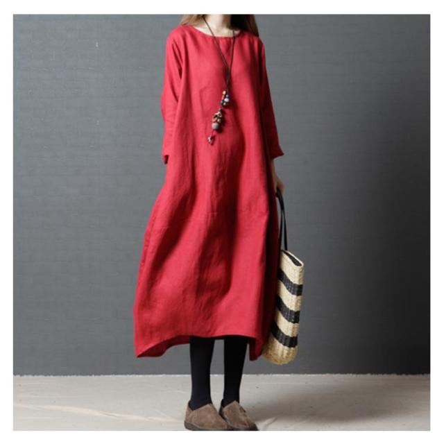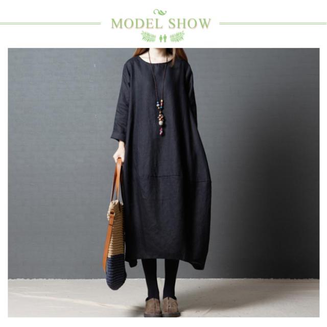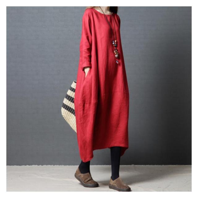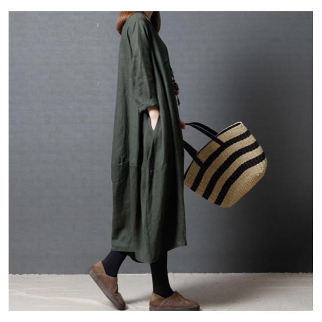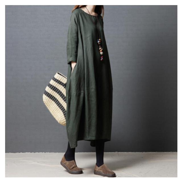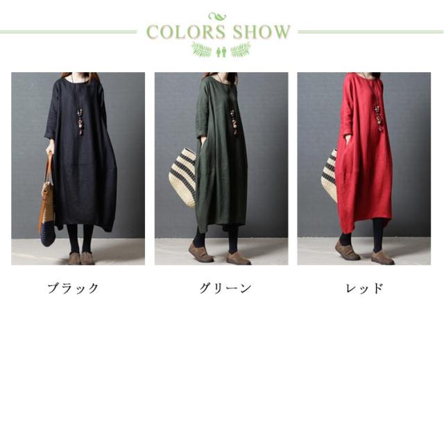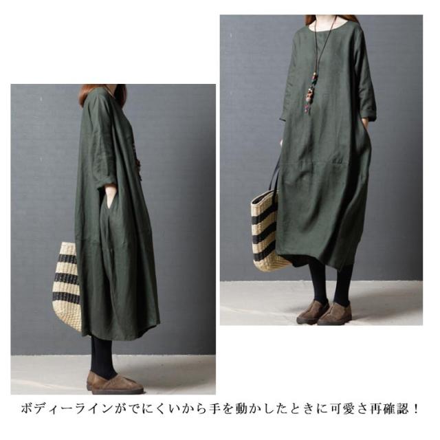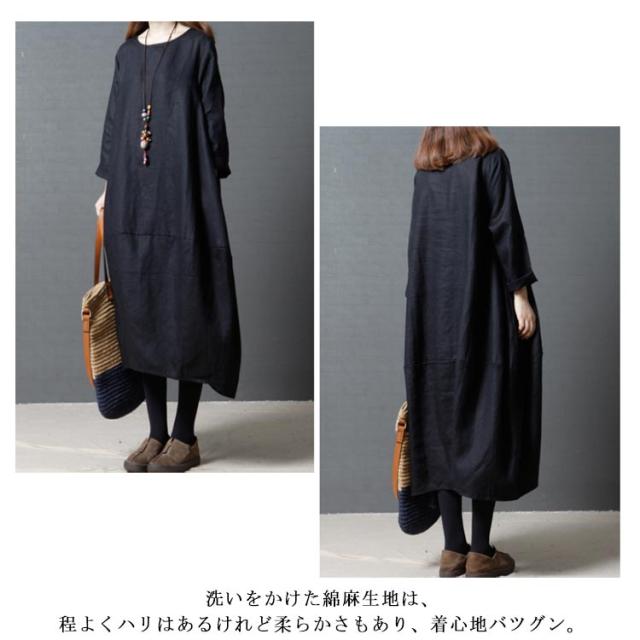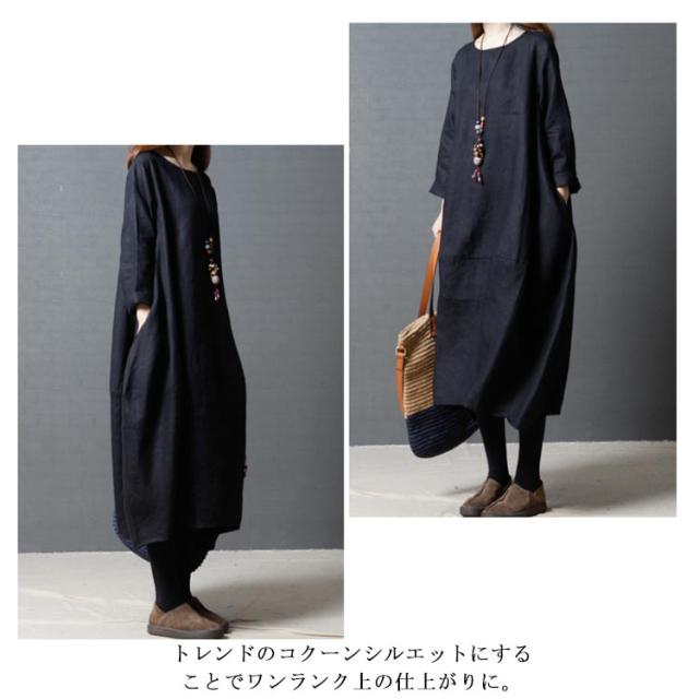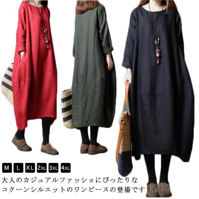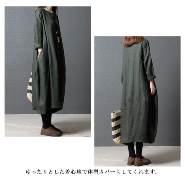 送料無料 綿麻ワンピース ボートネック バルーンシルエット 長袖 ロング丈 チュニック 無地 ワンピ ポケット Uネック レディース 春 夏 綿 麻 綿麻素材 コクーンシルエット マタニティー カジュアル
